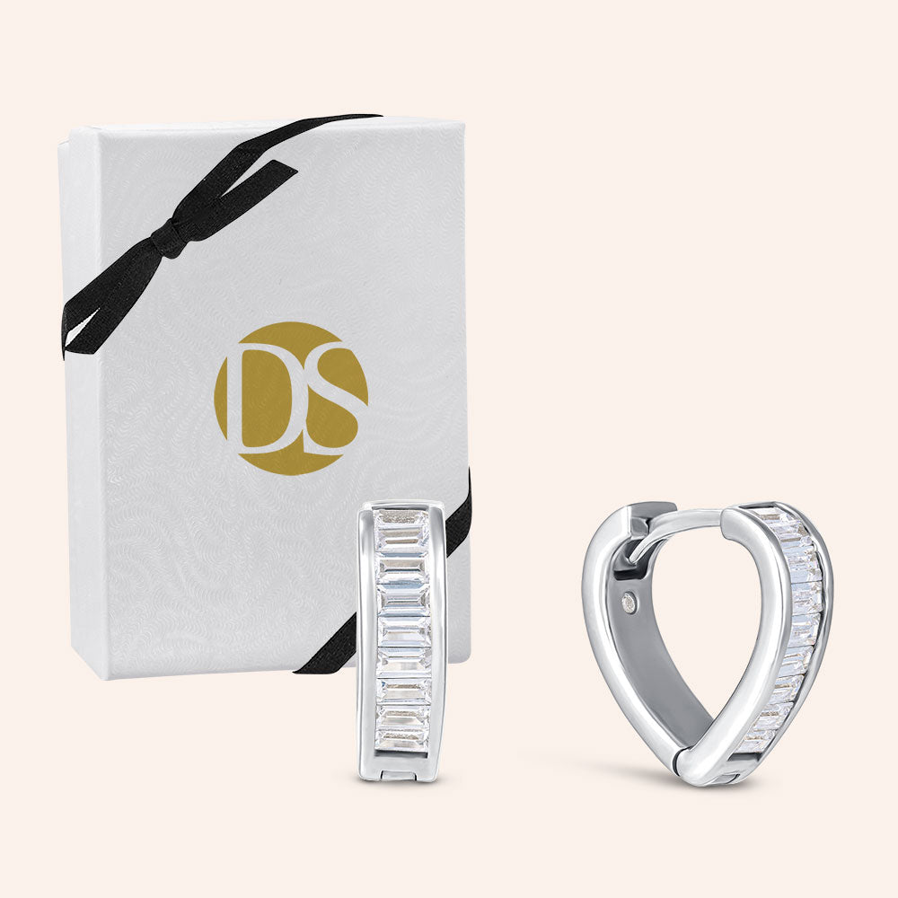 Elegance is eternal. No wonder these hoops promises to be your forever earring. The design features a chic heart shape embellished with baguettes that will beautifully showcases from all the right angles. Made for powering up your everyday ensembles. • Embellished with Baguette CZ’s • Pierced with Clutch backs • Crafted in Silver Plated Brass • Lead and Nickel Free • Dimensions: 0.55" in Diameter • Comes packaged in a Gift Box as shown