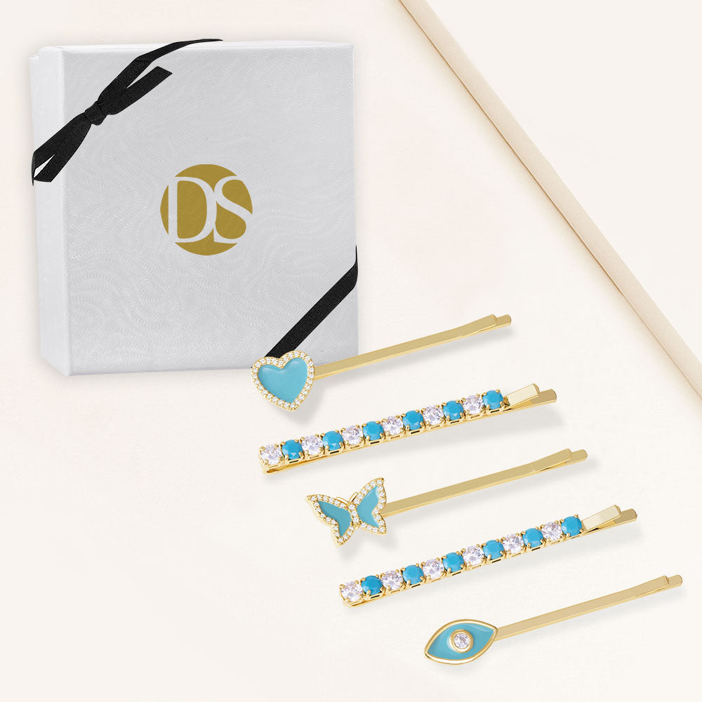 Make a soaring impression with your style in this brilliant hair pin set! Featuring a trio of Enamel symbols combined with two Prong-set Turquoise and Cubic Zirconia stones hair pins, for a fun finishing touch. Wear them all for a dramatic look or pick one or two for a luminous touch. • Pave Prong-set Round Cut Stones & Enamel • Dimensions: - Heart, Butterfly, and Evil Eye Hair Pin Length: 1.77” - Turquoise and CZ stones Hair Pins Length: 2.25” • Lead and Nickel Free 18K Gold Plated Brass • Comes Packaged in a Gift Box as shown