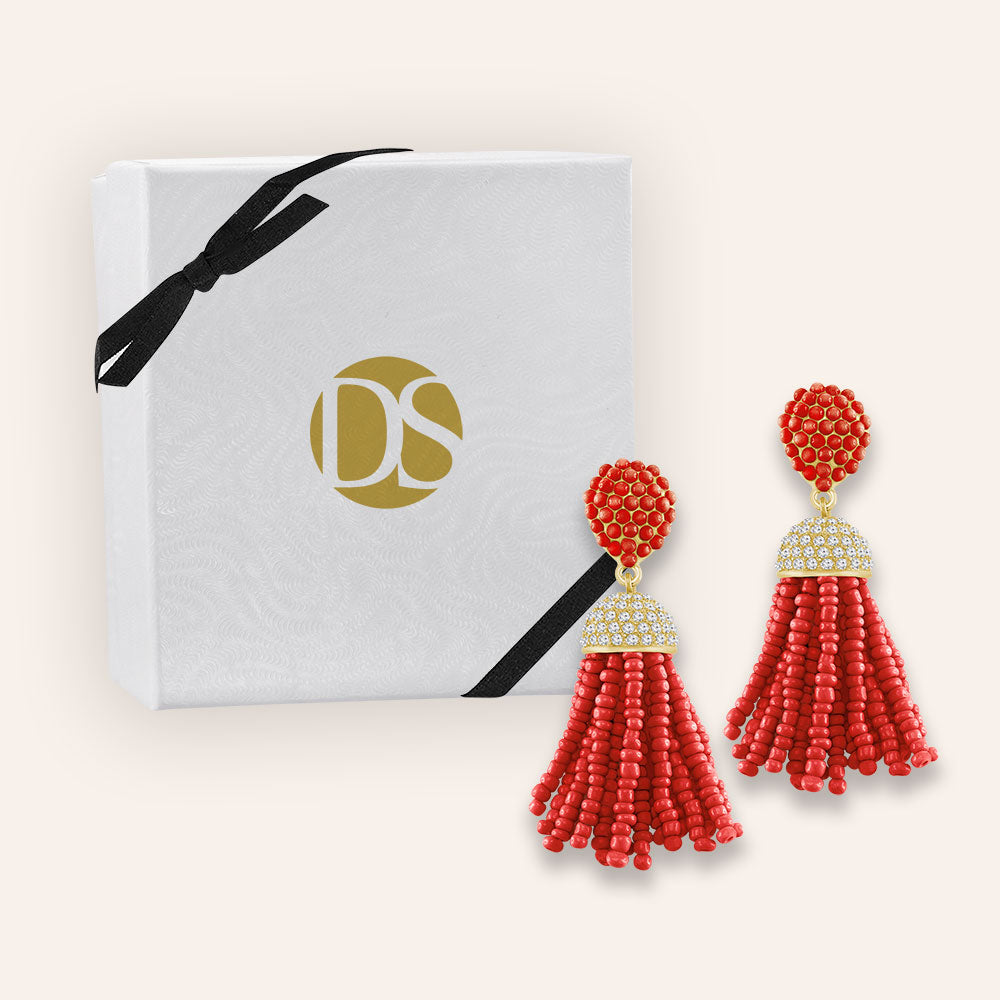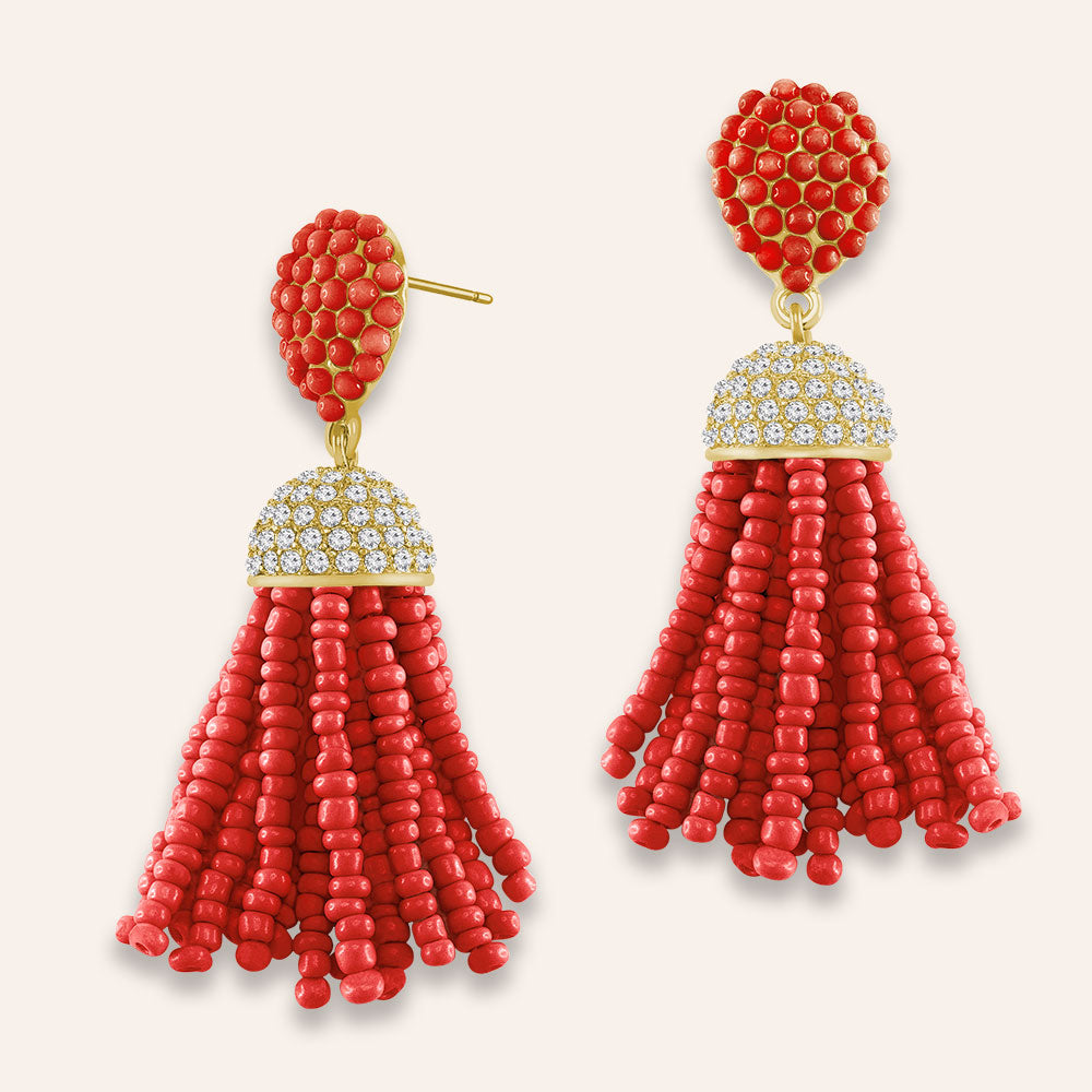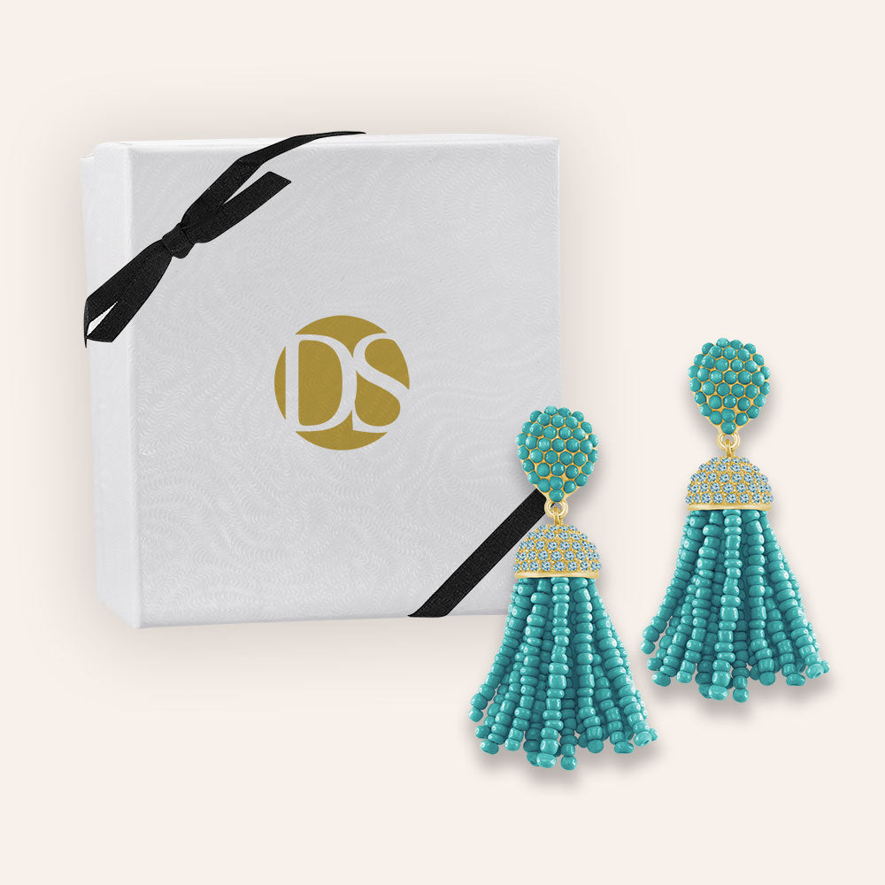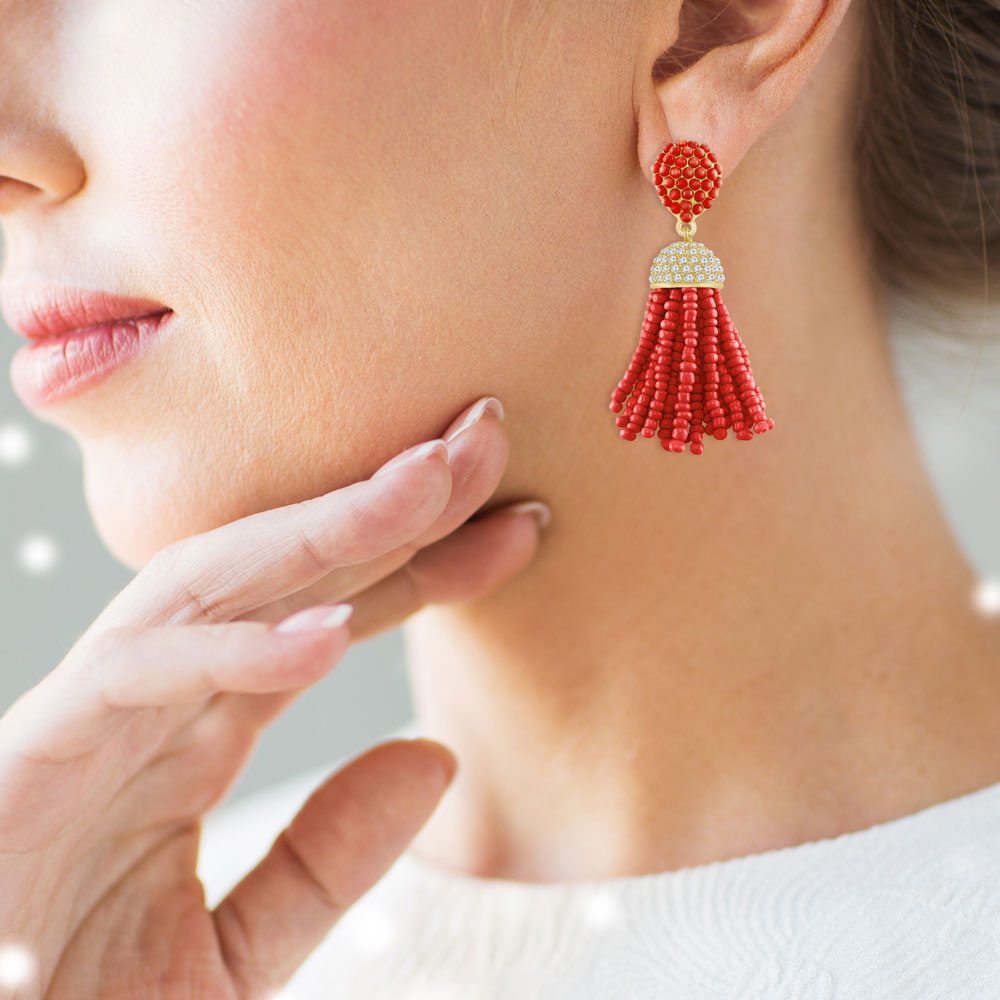 Tassel jewelry is a big thing right now... These handcrafted beaded tassel drops with sparkling crystals are fun yet dazzling statement pieces with eye-catching color and charming movement. Let these super lightweight earrings polish off all your summer outfits for a fun look. Be tassel and Swing!