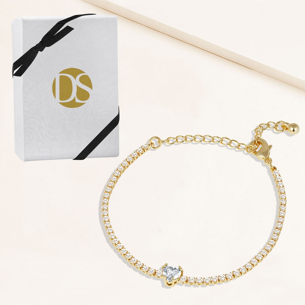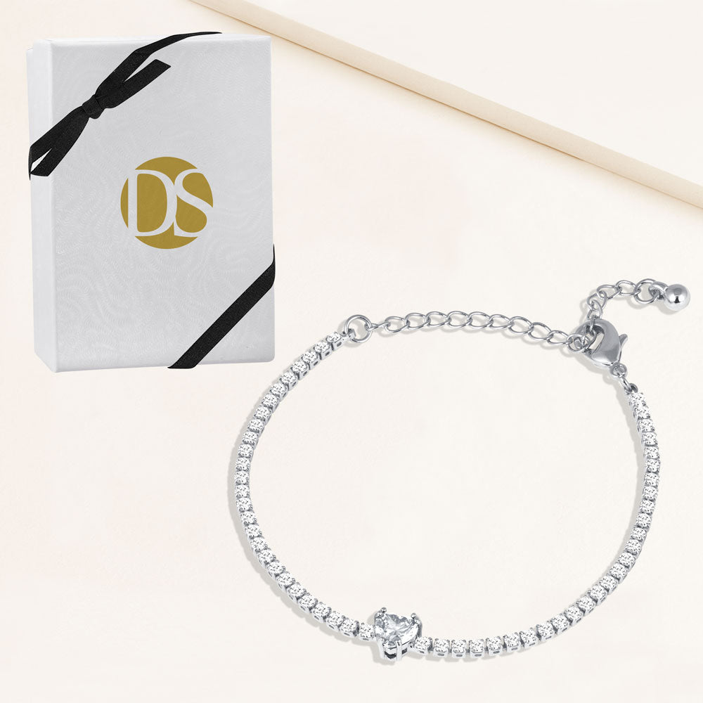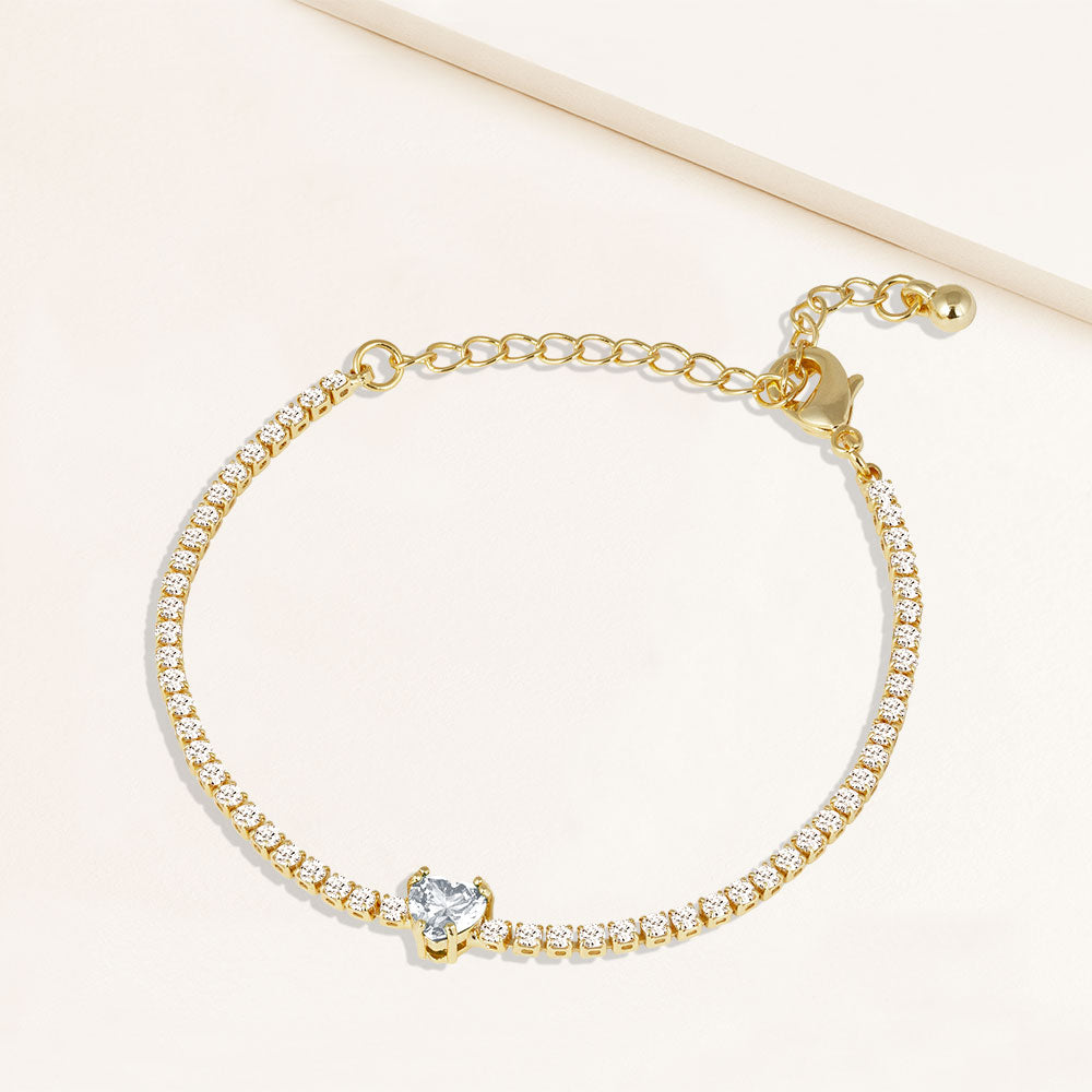 Eyes will be smiling when they catch a glimpse of the sparkling heart perched on this shimmering tennis bracelet, a sweet find for a lucky lass, or for anyone "just because."
