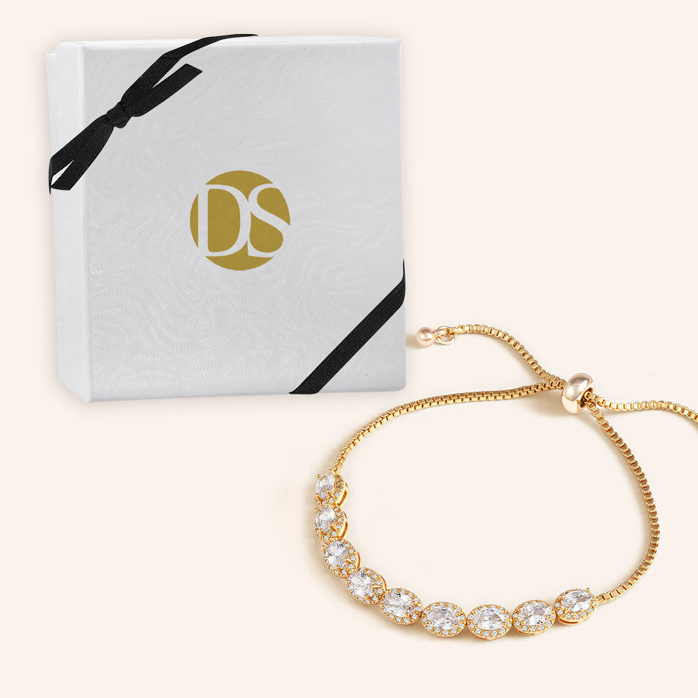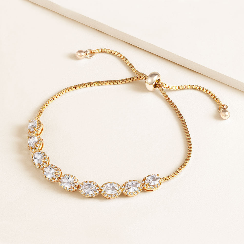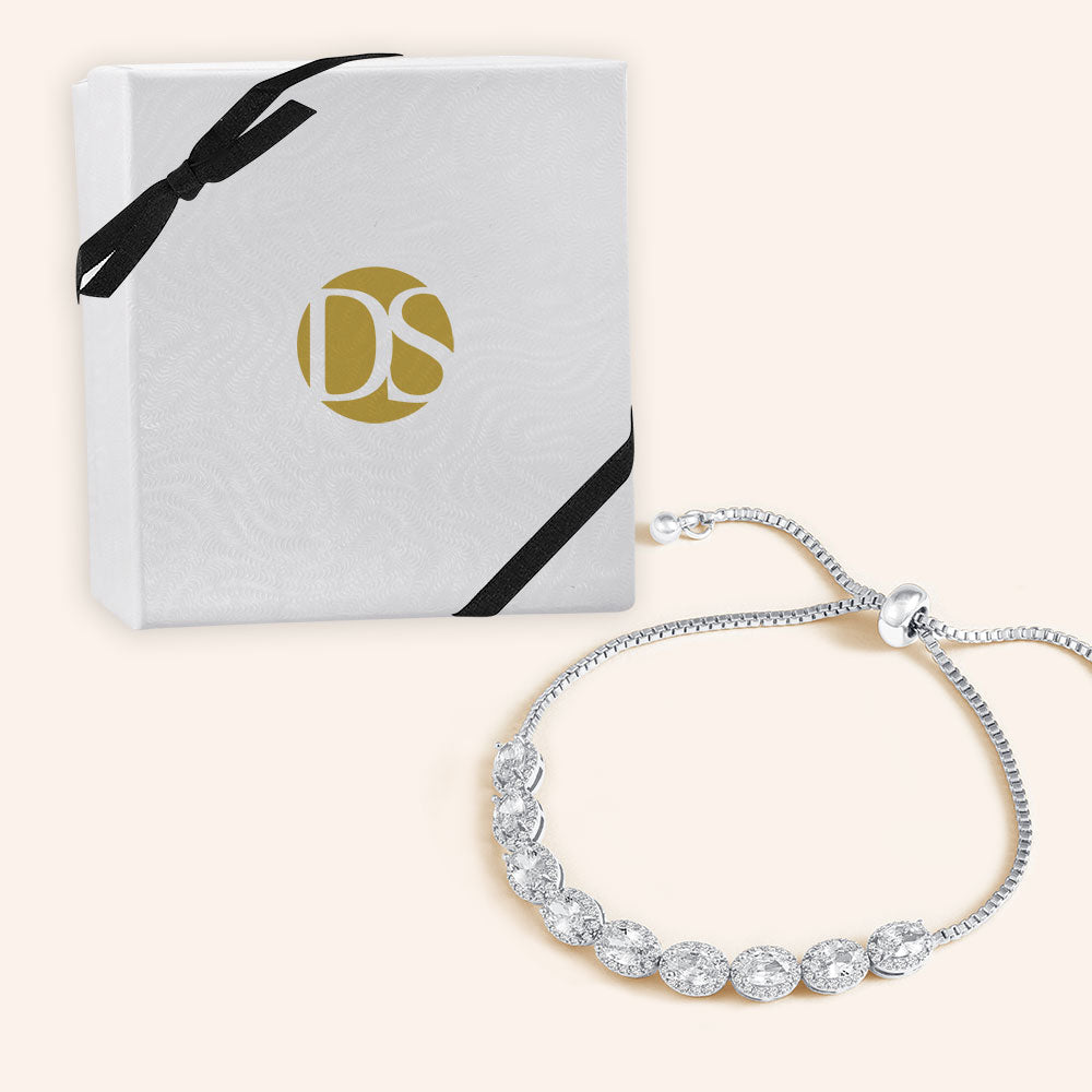 Bring a touch of chic sophistication to your wrist with the luxe look of halo Oval cut stones in an adjustable bolo-style bracelet. Looks lovely worn alone or layered with other favorite pieces. Slip on this beautiful bracelet and get ready to shine!