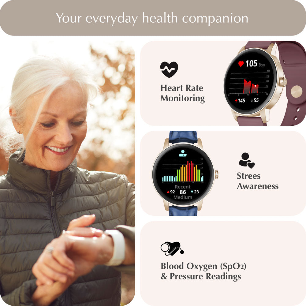 The Ora by Daniela Swaebe brings together elegance, versatility, wellness and intelligent performance in one refined smartwatch. Thoughtfully crafted for everyday life, it helps you stay connected, active, and aware throughout your day. With five (5) watch bands included to match any style, a vivid 1.30” display, smart notifications to keep you informed, over 100 sport modes, an ultra-lightweight design, and long battery life, the Ora Smartwatch offers the ideal balance of sophistication and function, designed to complement your vibe wherever the day takes you.