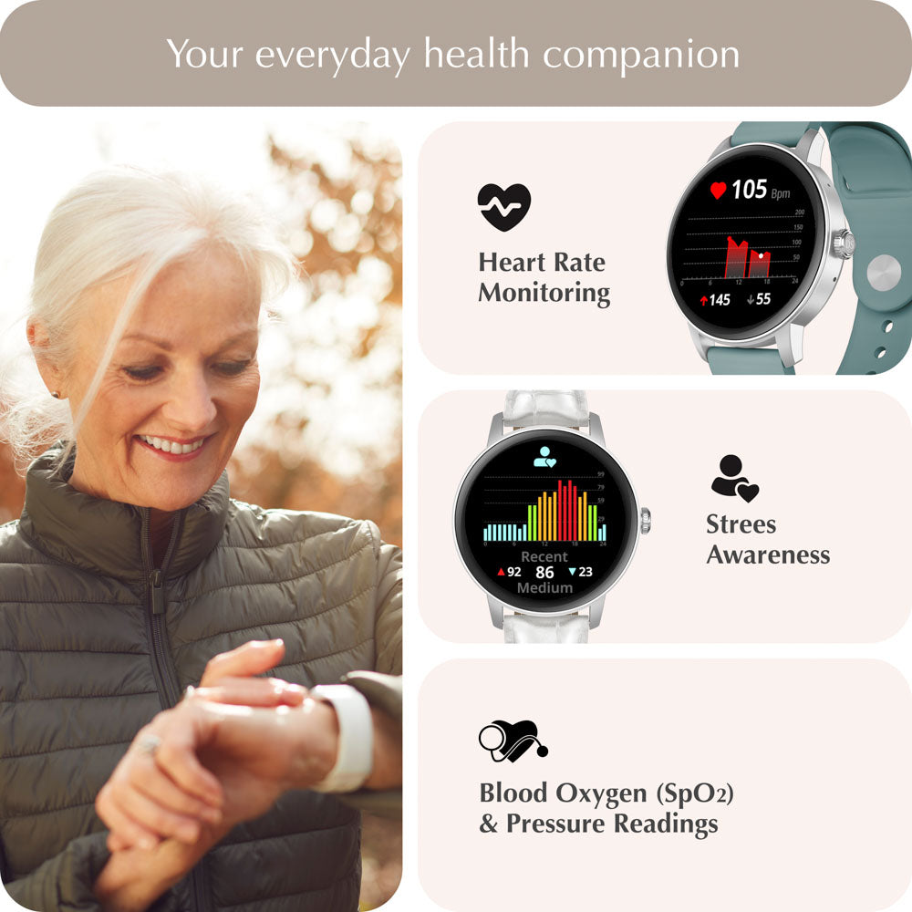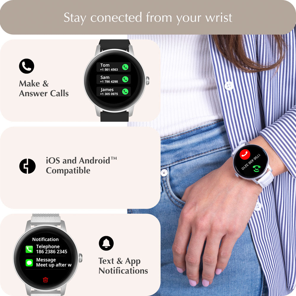 The Ora by Daniela Swaebe brings together elegance, versatility, wellness, and intelligent performance in one refined smartwatch. Thoughtfully crafted for everyday life, it helps you stay connected, active, and aware throughout your day. With five (5) watch bands included to match any style, a vivid 1.30” display, smart notifications to keep you informed, over 100 sport modes, an ultra-lightweight design, and long battery life, the Ora Smartwatch offers the ideal balance of sophistication and function, designed to complement your vibe wherever the day takes you.