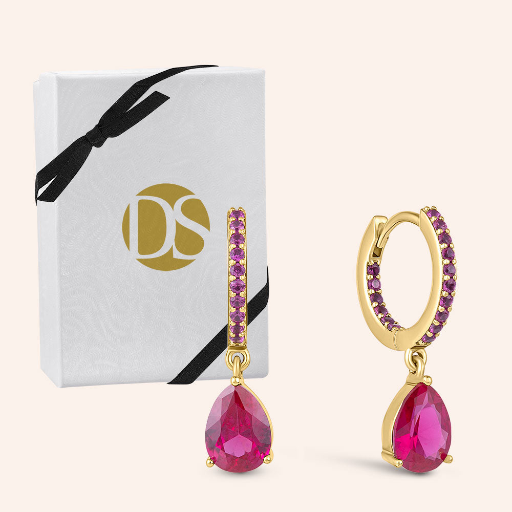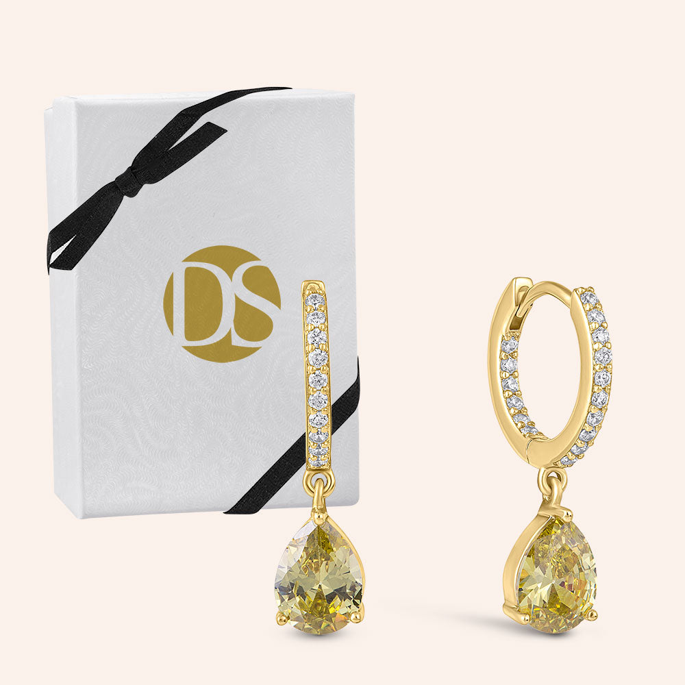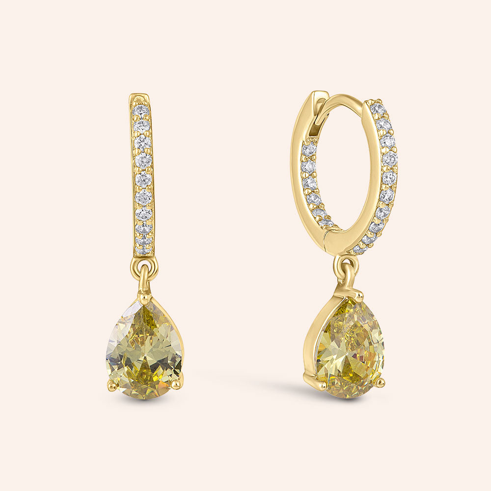 If there is something missing in your look, these magical earrings are here to solve the problem! The alluring and lightweight design embellished with a Colorful Prong-set Pear cut dangling stones and Micro-Pave CZ's will not only compliment your style but will also add a captivating look to any outfit. You won’t recall a day without them! • Embellished with Prong Set Pear Cut Stone: 8 x 6 mm. • Dimensions: 0.95” Height x 0.24” Wide • Huggie Style Closure 0.6" in outside diameter • Crafted in 18K Gold Plated Brass • Lead and Nickel Free • Comes packaged in a Gift Box as shown
