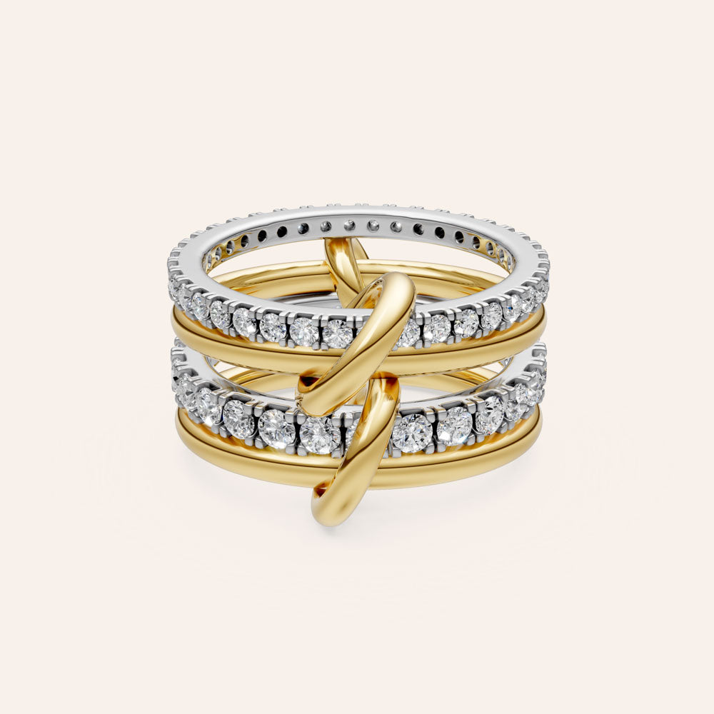 Make a bold statement with the Linked Forever 4 Rows Stacked Pave Ring. Featuring four interlinked rows adorned with sparkling pave stones in a stunning two-tone design, this ring combines luxury and modern elegance. The intricate stacked effect, with its shimmering details, adds depth and sophistication to any ensemble, making it a perfect piece for both day and night.